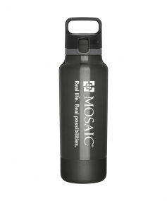 25 oz double wall 18/8 stainless steel thermal bottle with copper vacuum insulation, threaded one-touch push-button lid, locking mechanism, carrying handle, and rubberized base - patent pending - gift box included; Hand wash recommended; Do not microwave; 11 h x 3 w ; 739mL.